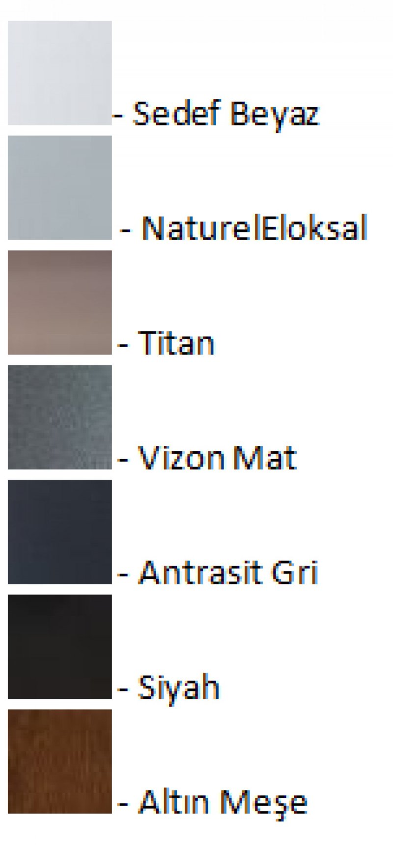 • Alüminyum profillerde 7 farklı renk seçeneği sunulmaktadır.
